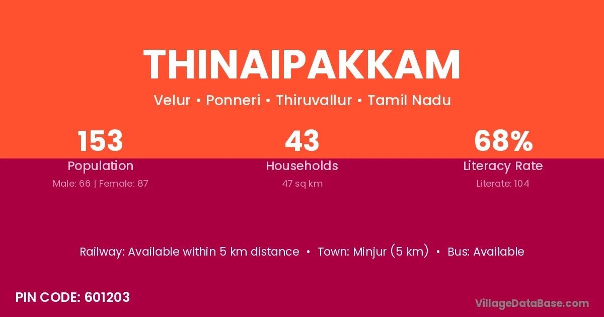 Thinaipakkam village has a total population of 153 people, of which 66 are males and 87 are females.