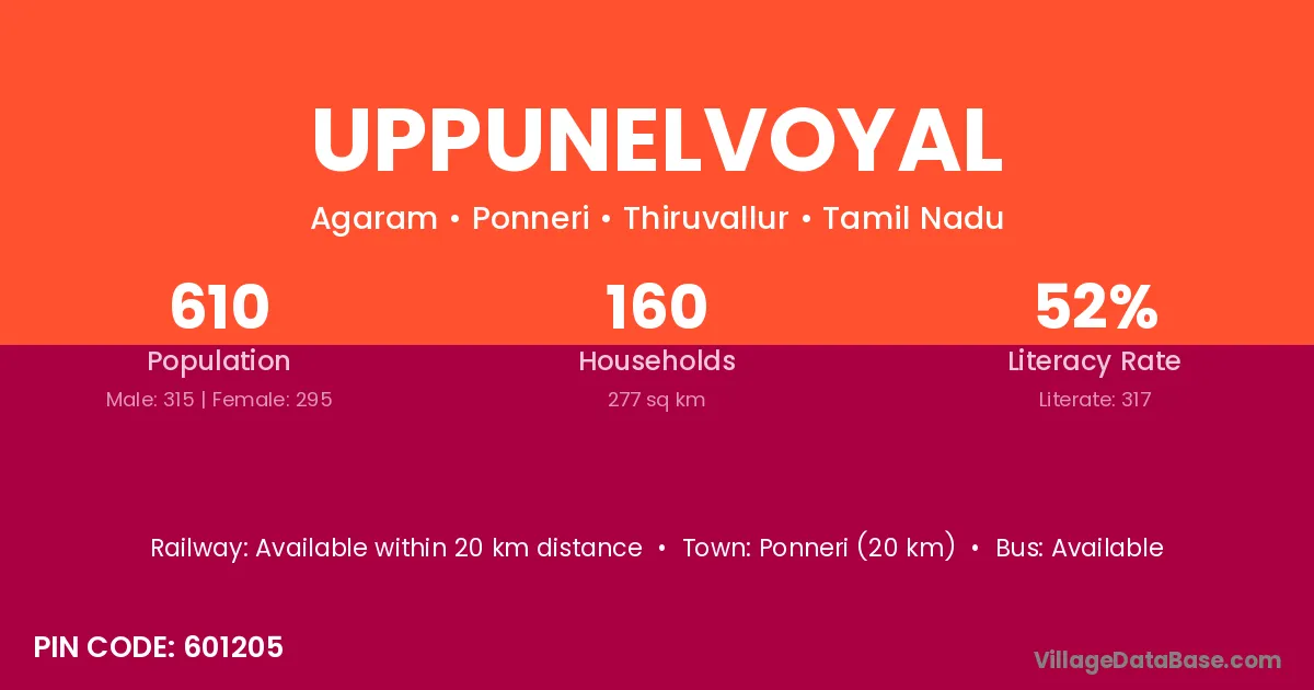Ponneri (20 km) is the nearest town to Uppunelvoyal village for major economic activities and is located approximately 20 km away.