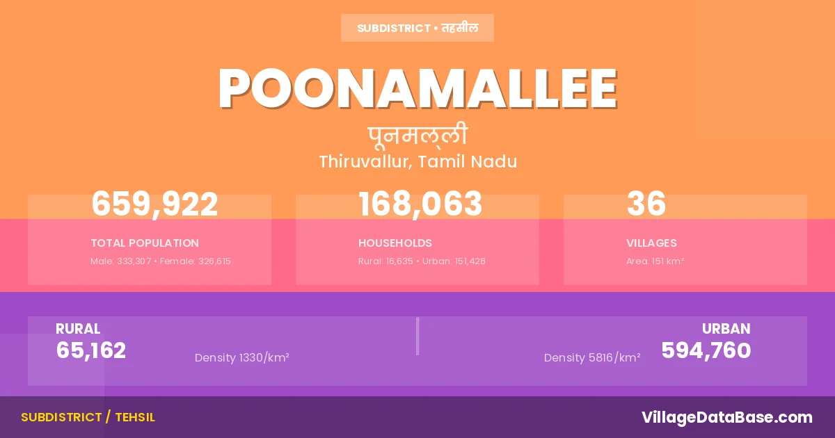 According to the 2011 census The total area of Poonamallee Taluka is 151 km², with a population of 659922 people. The population density is 4,362 inhabitants per square kilometre, and there are approximately 168063 houses in the sub district.