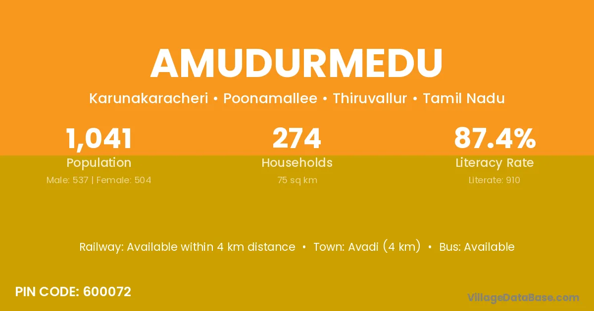 Amudurmedu village has a total population of 1,041 people, of which 537 are males and 504 are females.
