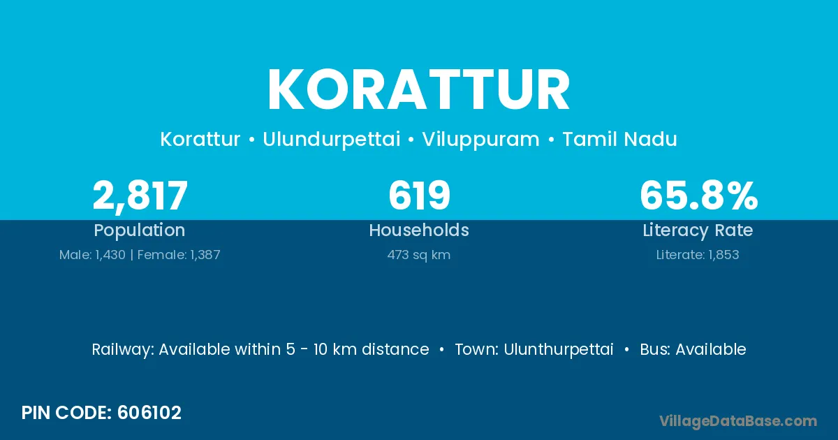 Korattur village has a total population of 6,528 people, of which 3,269 are males and 3,259 are females.