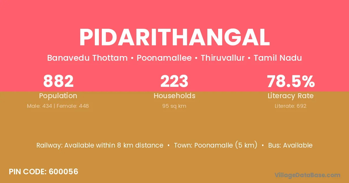 Poonamalle (5 km) is the nearest town to Pidarithangal village for major economic activities and is located approximately 5 km away.