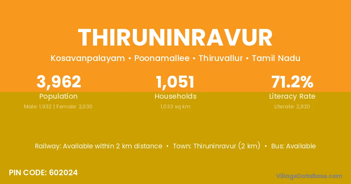 According to Census 2011 information, the village code of Thiruninravur village is 602024.