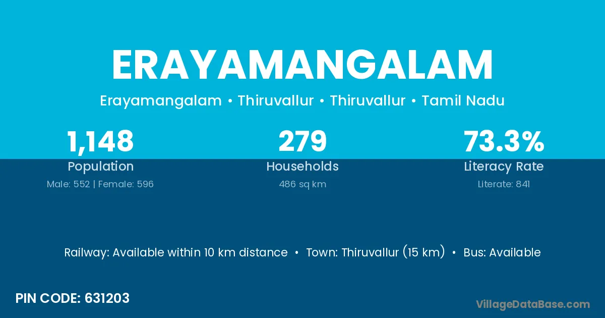 Thiruvallur (15 km) is the nearest town to Erayamangalam village for major economic activities and is located approximately 15 km away.