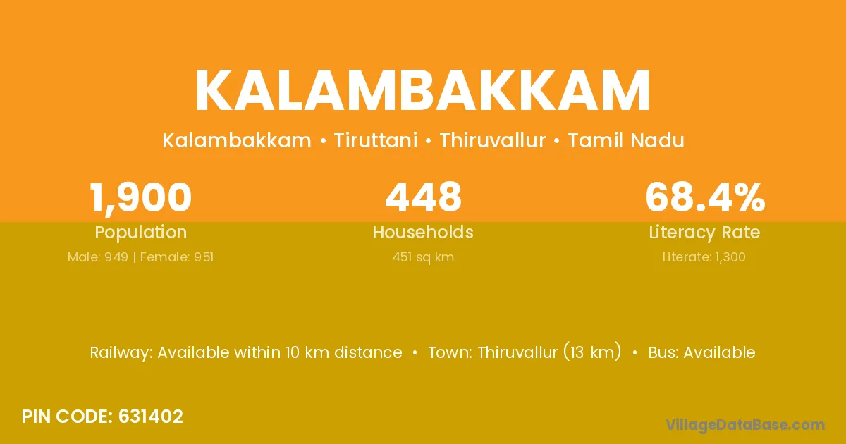Thiruvallur (13 km) is the nearest town to Kalambakkam village for major economic activities and is located approximately 13 km away.