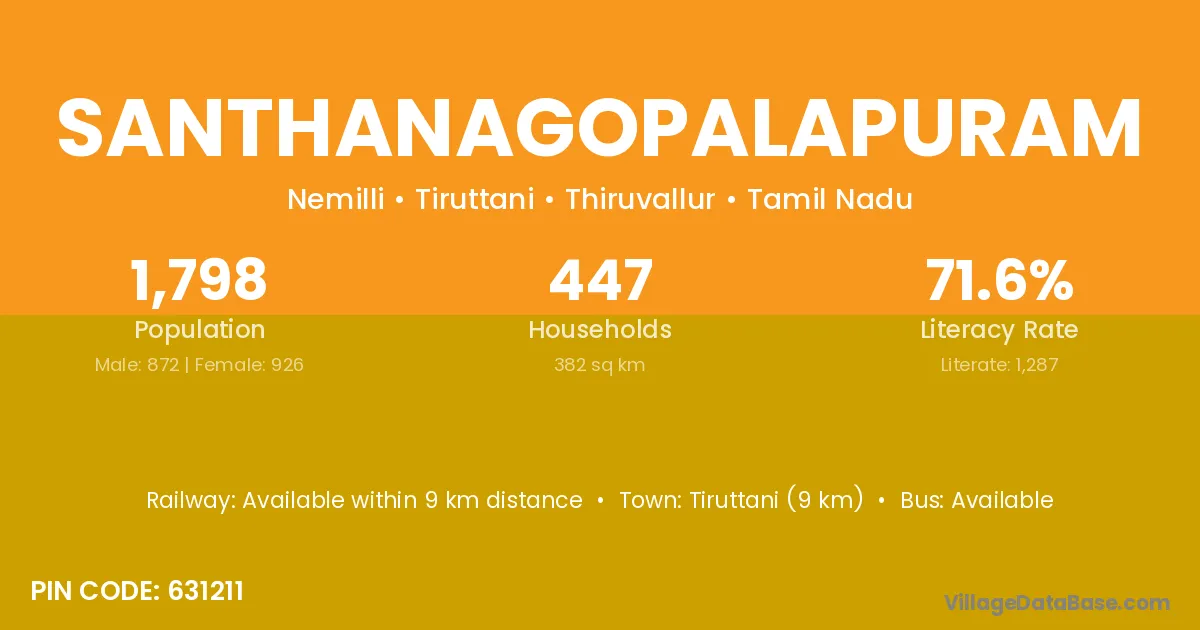 Santhanagopalapuram village has a total population of 1,798 people, of which 872 are males and 926 are females.