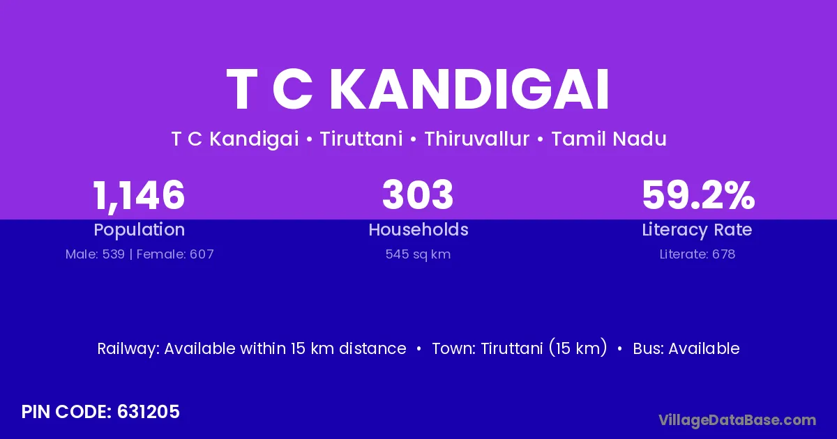T C Kandigai village has a total population of 1,146 people, of which 539 are males and 607 are females.