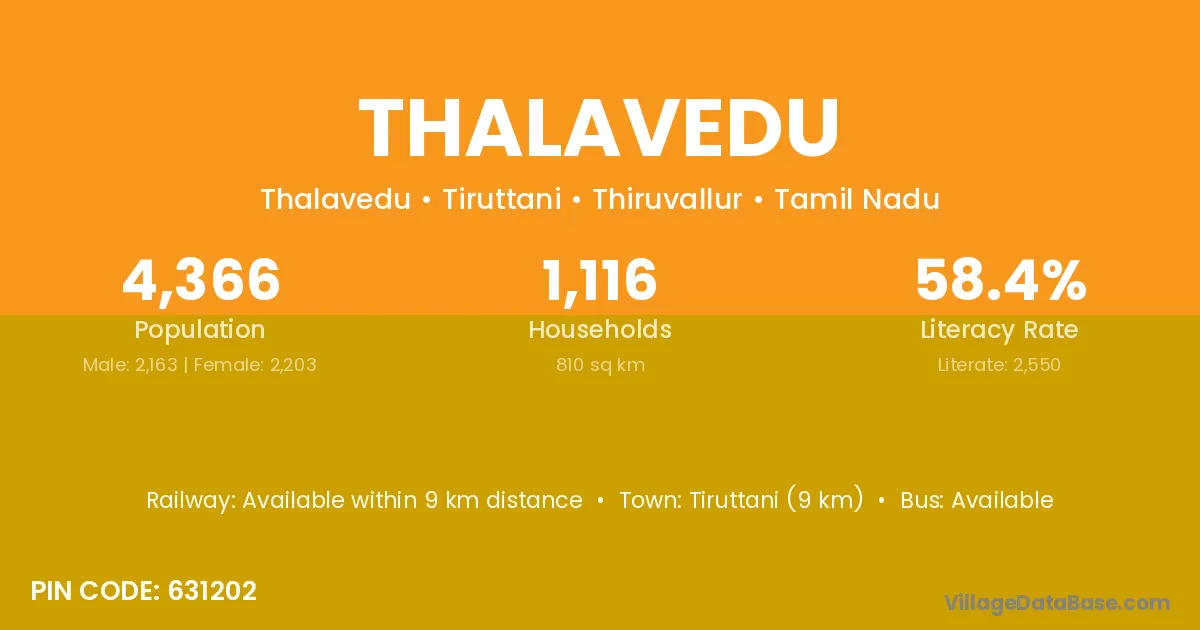 Tiruttani (9 km) is the nearest town to Thalavedu village for major economic activities and is located approximately 9 km away.