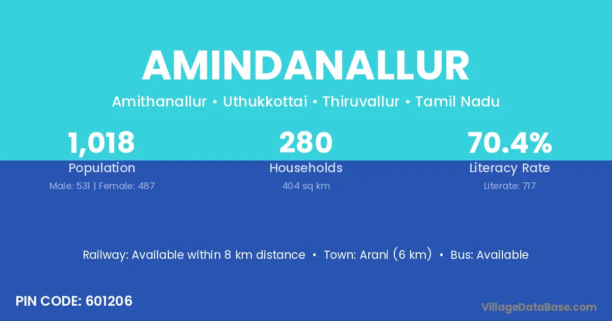 Amindanallur village has a total population of 1,018 people, of which 531 are males and 487 are females.