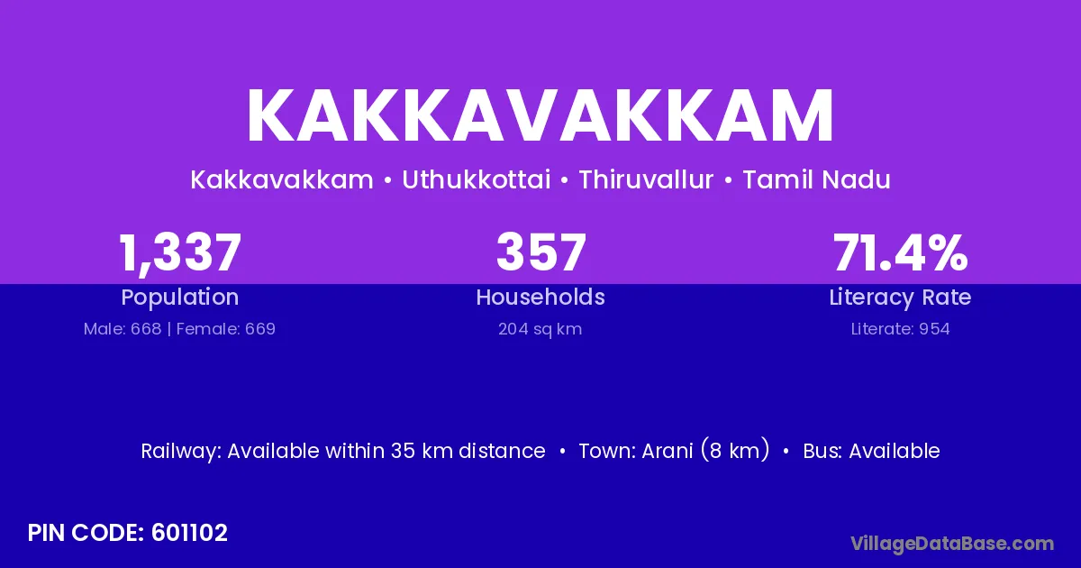 Kakkavakkam village has a total population of 1,337 people, of which 668 are males and 669 are females.