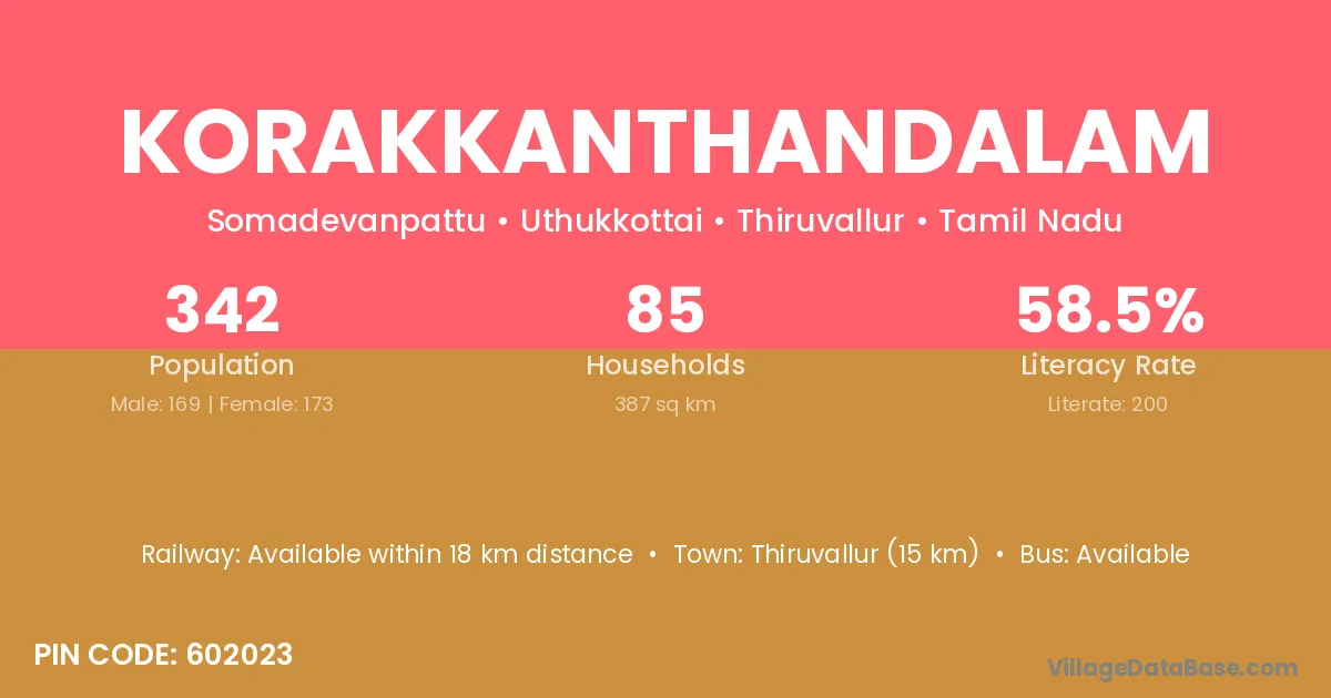 Korakkanthandalam village has a total population of 342 people, of which 169 are males and 173 are females.