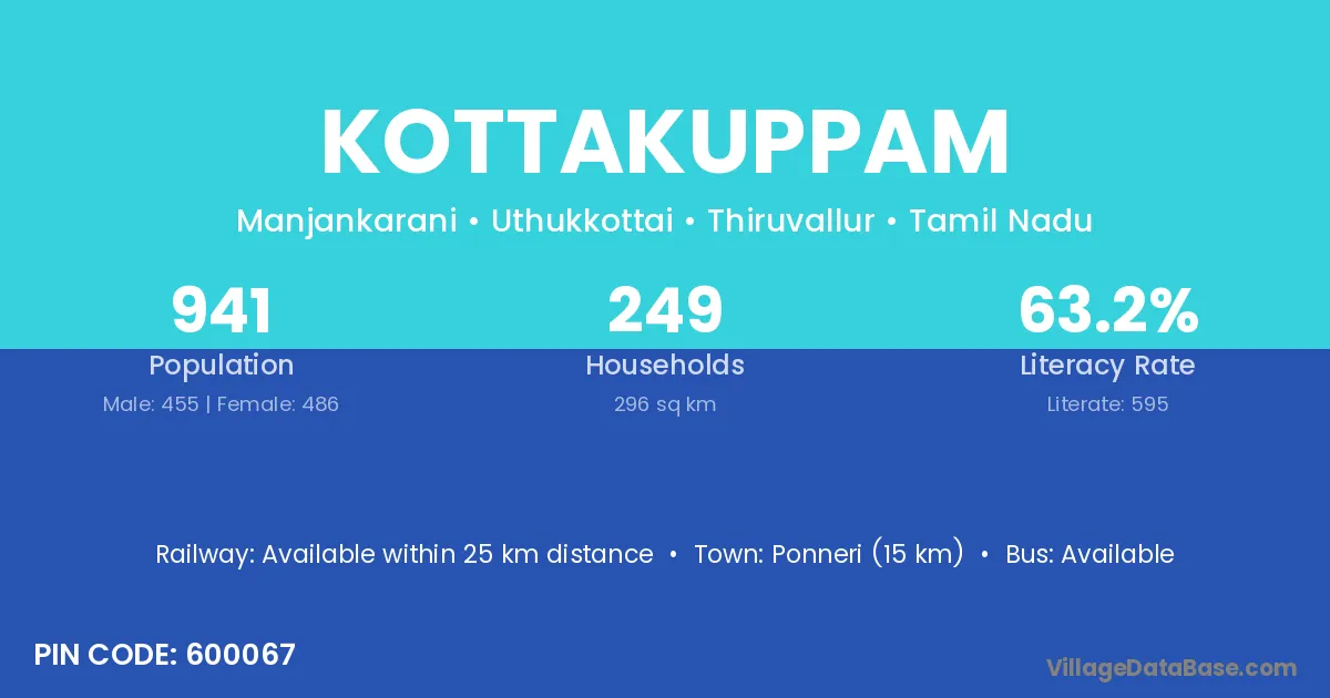 Ponneri (15 km) is the nearest town to Kottakuppam village for major economic activities and is located approximately 15 km away.