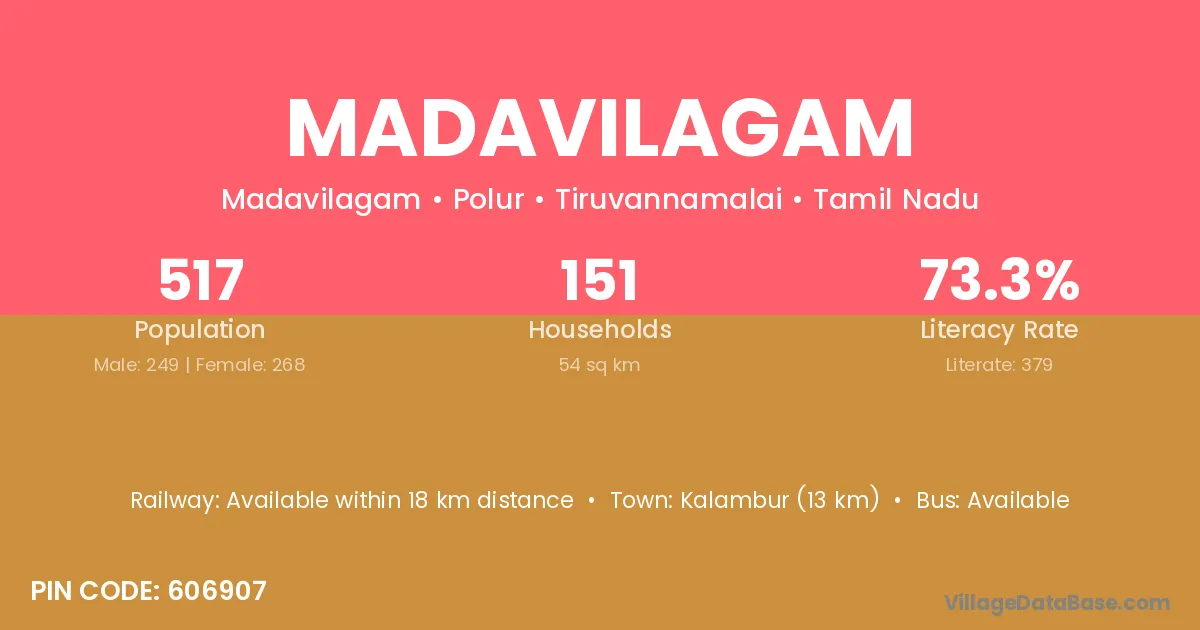 Thirunindravur (17 km) is the nearest town to Madavilagam village for major economic activities and is located approximately 17 km away.
