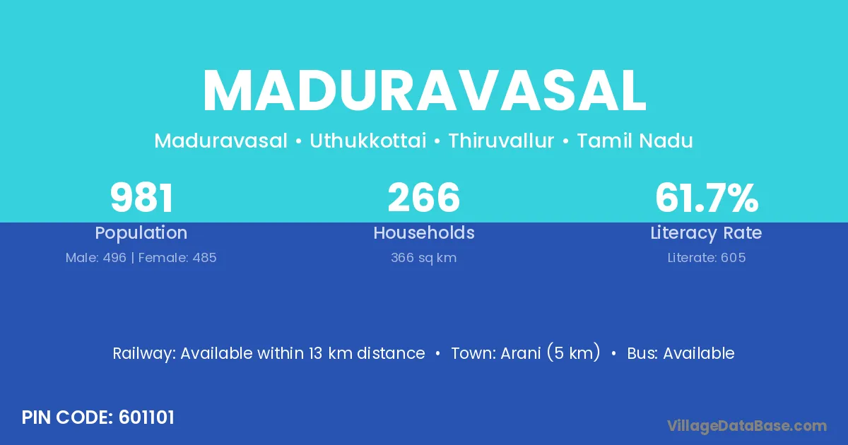 Arani (5 km) is the nearest town to Maduravasal village for major economic activities and is located approximately 5 km away.