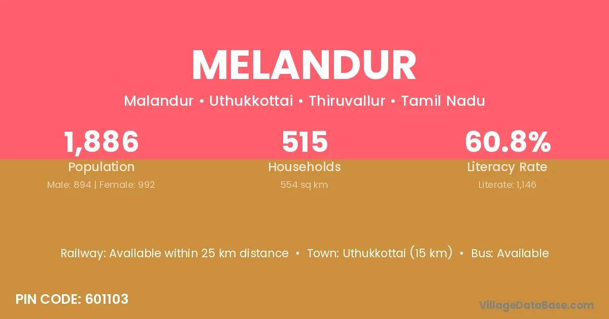 Uthukkottai (15 km) is the nearest town to Melandur village for major economic activities and is located approximately 15 km away.