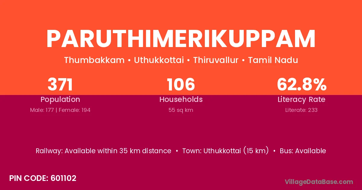 Uthukkottai (15 km) is the nearest town to Paruthimerikuppam village for major economic activities and is located approximately 15 km away.