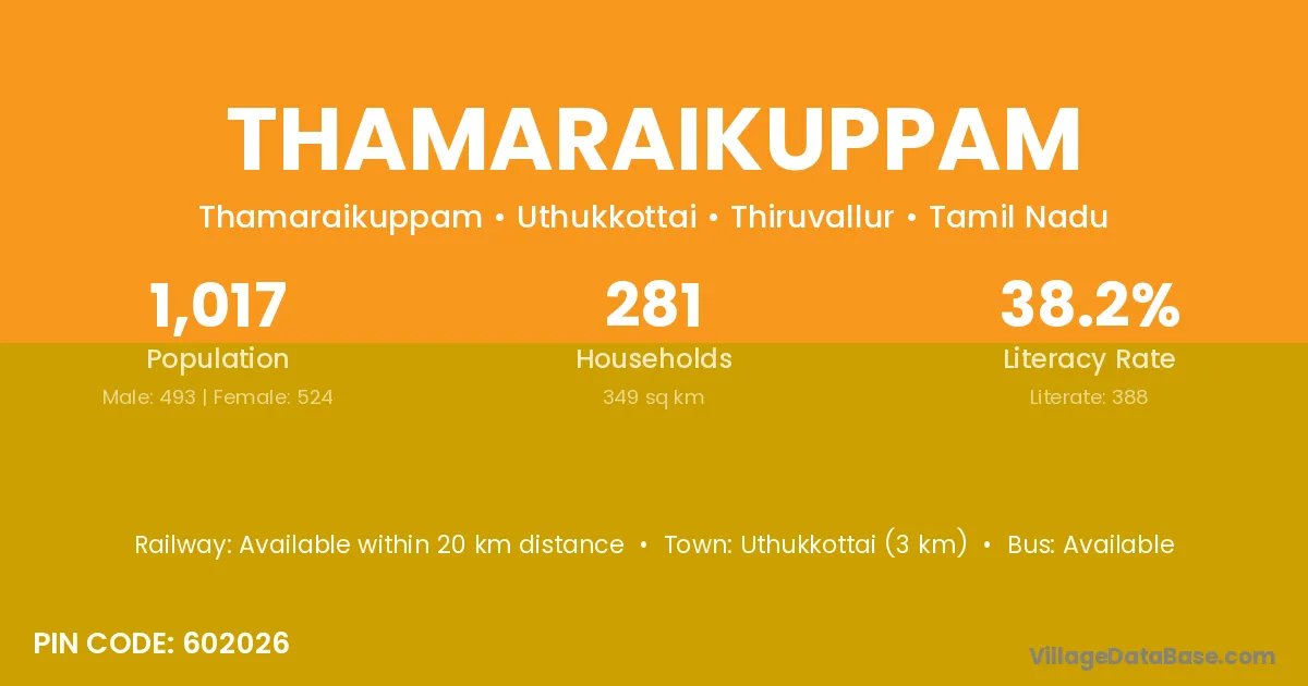 Uthukkottai (3 km) is the nearest town to Thamaraikuppam village for major economic activities and is located approximately 3 km away.