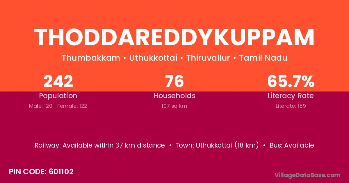 Uthukkottai (18 km) is the nearest town to Thoddareddykuppam village for major economic activities and is located approximately 18 km away.