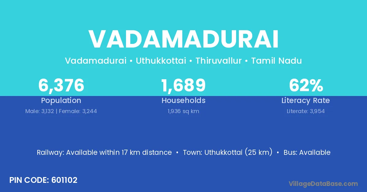 Uthukkottai (25 km) is the nearest town to Vadamadurai village for major economic activities and is located approximately 25 km away.