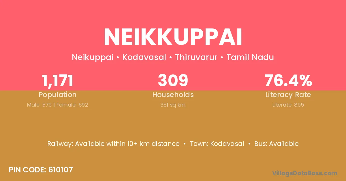 Neikkuppai village has a total population of 1,171 people, of which 579 are males and 592 are females.