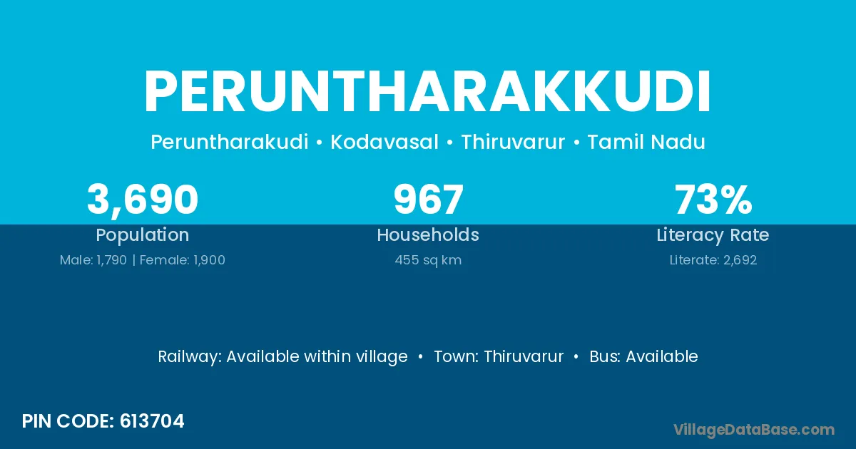 Peruntharakkudi village has a total population of 3,690 people, of which 1,790 are males and 1,900 are females.