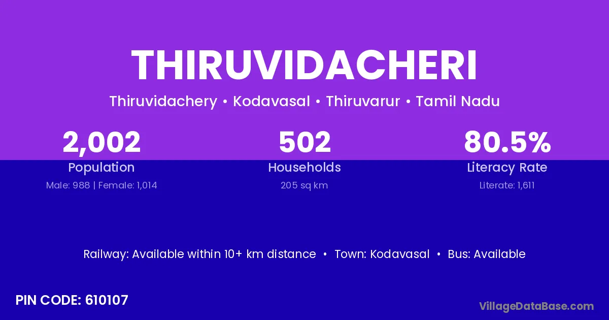 Thiruvidacheri village has a total population of 2,002 people, of which 988 are males and 1,014 are females.