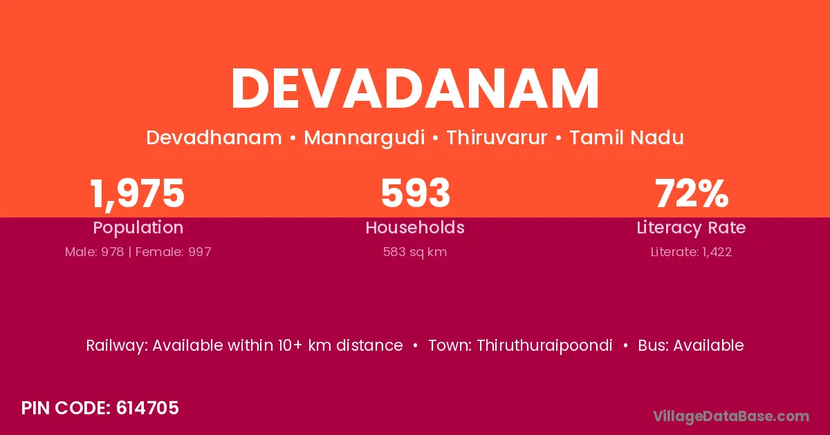 Devadanam village has a total population of 1,975 people, of which 978 are males and 997 are females.