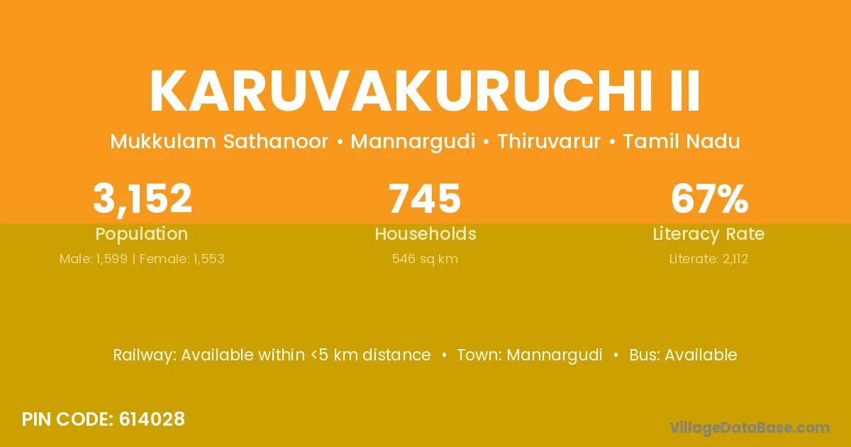 Karuvakuruchi Ii village has a total population of 3,152 people, of which 1,599 are males and 1,553 are females.