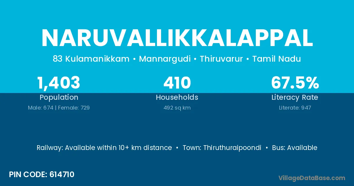 Naruvallikkalappal village has a total population of 1,403 people, of which 674 are males and 729 are females.
