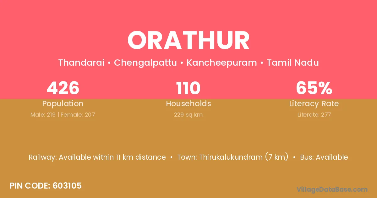 The literacy rate of Orathur village is 74.03%. Male literacy stands at 82.33% and female literacy at 65.83%.