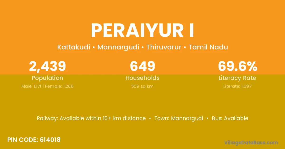 Peraiyur I village has a total population of 2,439 people, of which 1,171 are males and 1,268 are females.