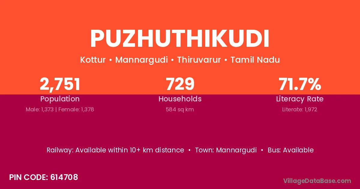 Puzhuthikudi village has a total population of 2,751 people, of which 1,373 are males and 1,378 are females.