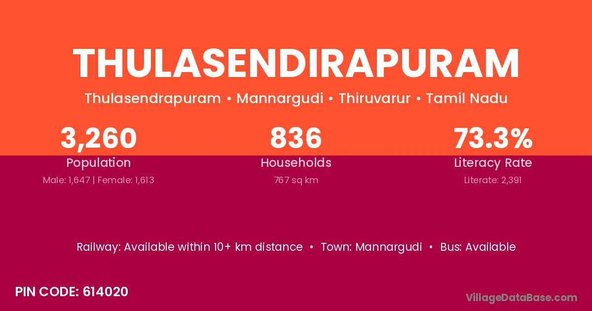 Thulasendirapuram village has a total population of 3,260 people, of which 1,647 are males and 1,613 are females.