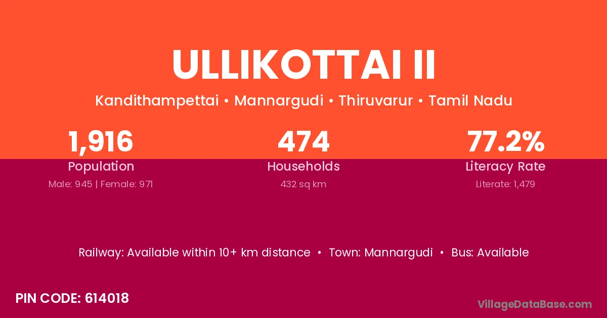 Ullikottai Ii village has a total population of 1,916 people, of which 945 are males and 971 are females.