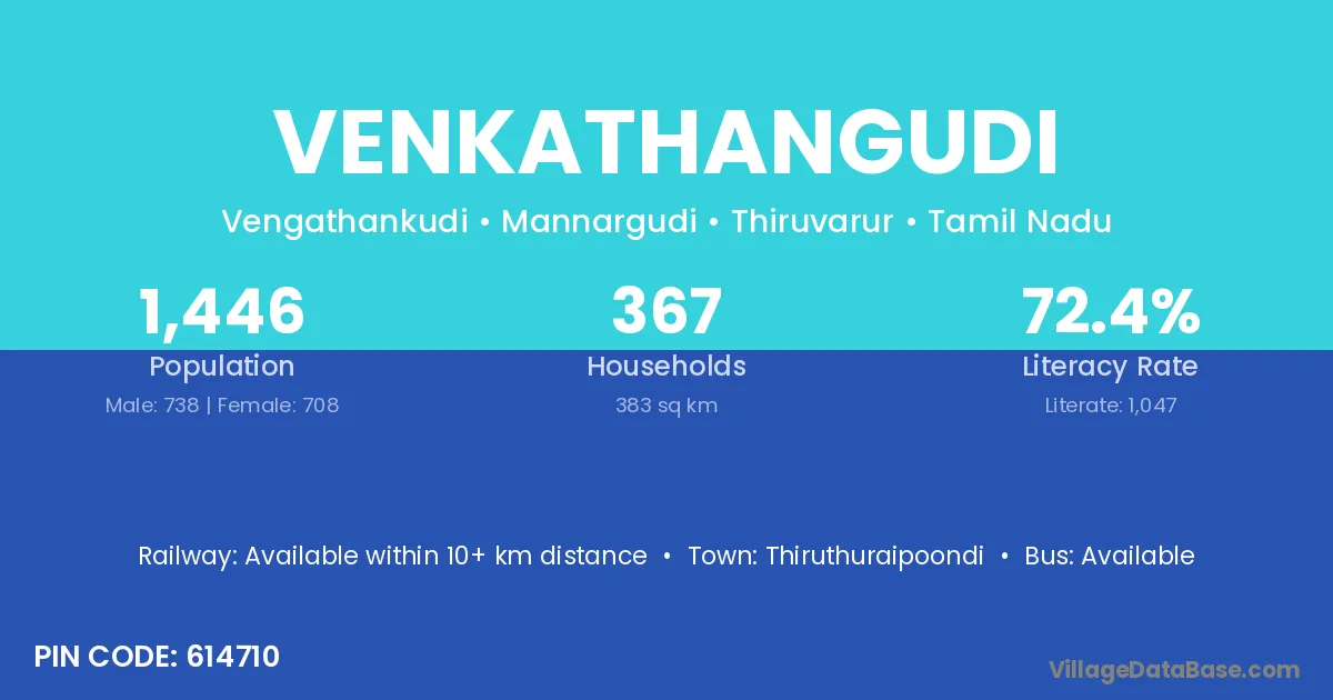 Venkathangudi village has a total population of 1,446 people, of which 738 are males and 708 are females.