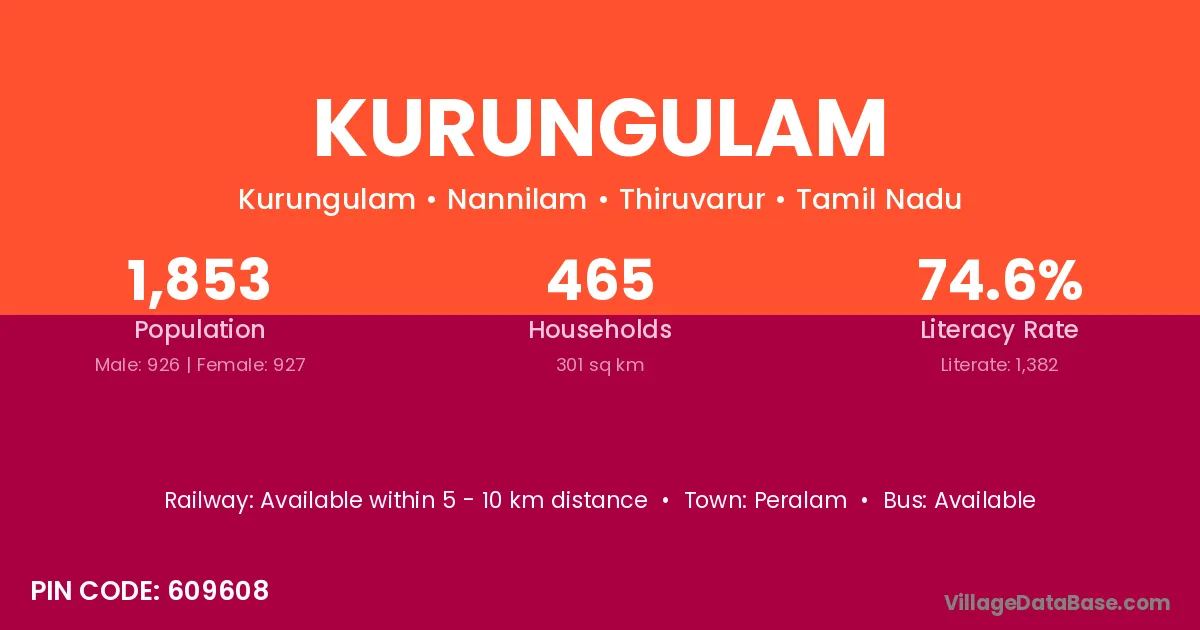 Kurungulam village has a total population of 1,853 people, of which 926 are males and 927 are females.