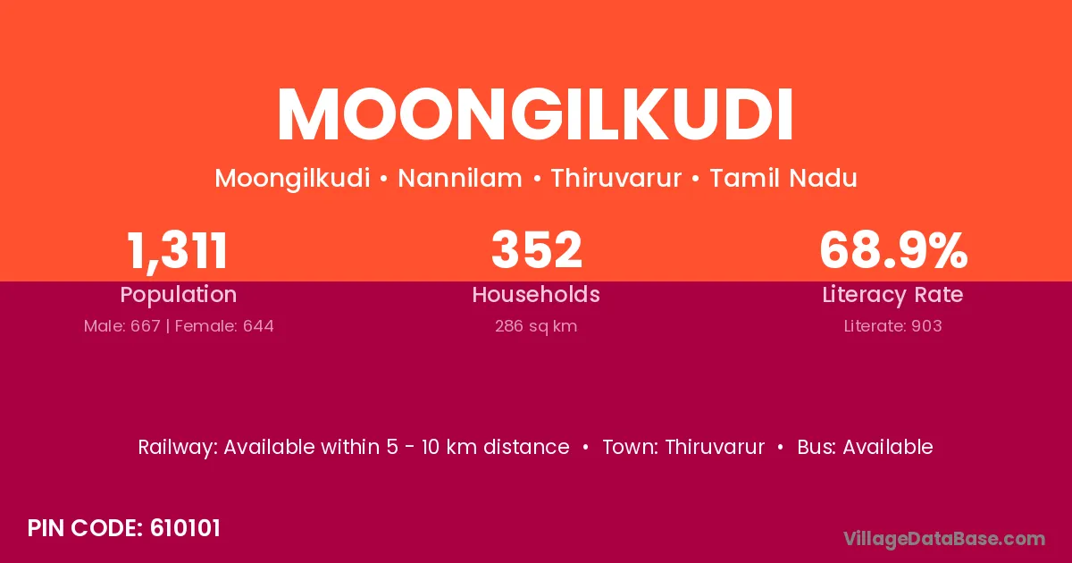 Moongilkudi village has a total population of 1,311 people, of which 667 are males and 644 are females.