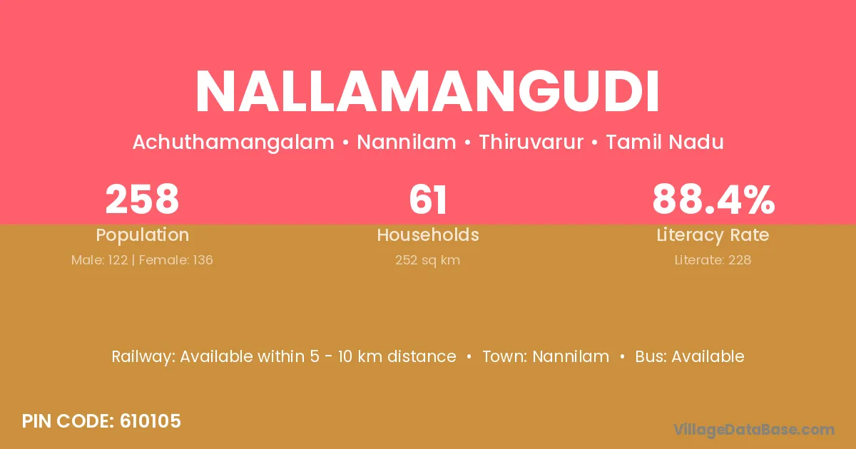 Nallamangudi village has a total population of 258 people, of which 122 are males and 136 are females.