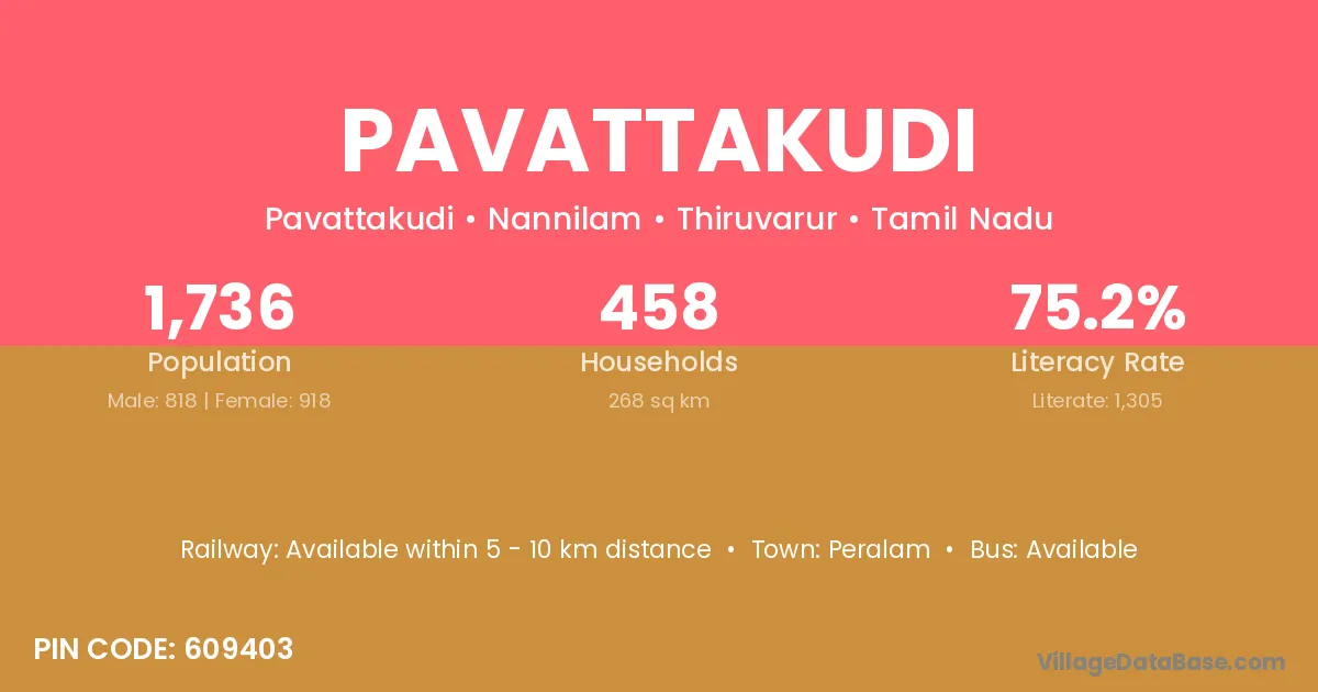 Pavattakudi village has a total population of 1,736 people, of which 818 are males and 918 are females.