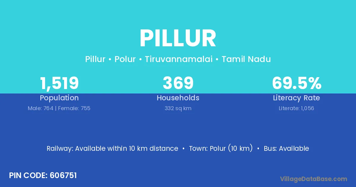 The literacy rate of Pillur village is 71.67%. Male literacy stands at 77.66% and female literacy at 65.15%.