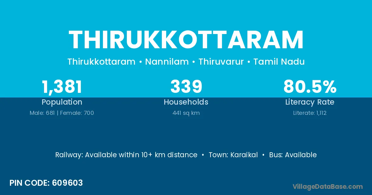 Thirukkottaram village has a total population of 1,381 people, of which 681 are males and 700 are females.