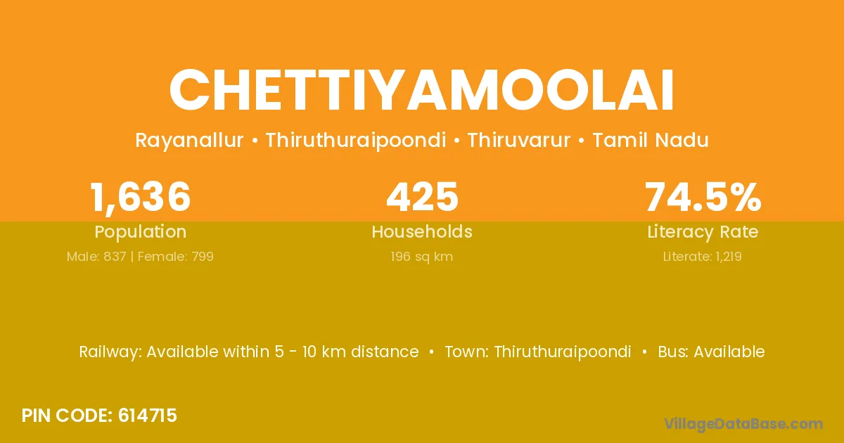 Thiruthuraipoondi is the nearest town to Chettiyamoolai village for major economic activities