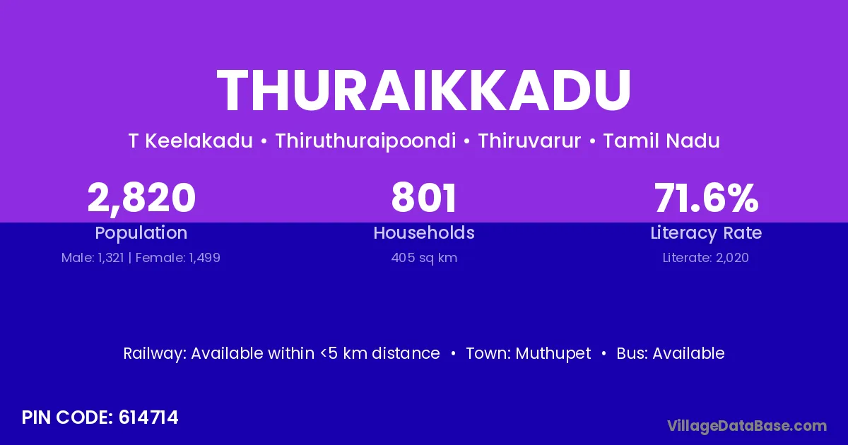 Thuraikkadu village has a total population of 2,820 people, of which 1,321 are males and 1,499 are females.