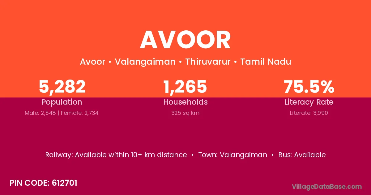 Avoor village has a total population of 5,282 people, of which 2,548 are males and 2,734 are females.