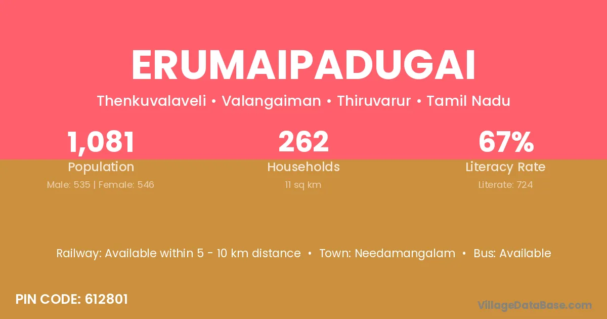 Needamangalam is the nearest town to Erumaipadugai village for major economic activities