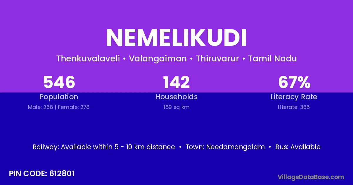 Needamangalam is the nearest town to Nemelikudi village for major economic activities