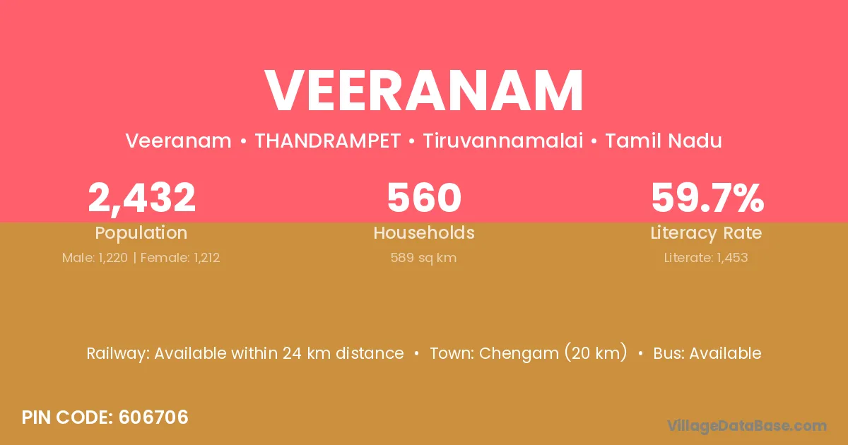 The literacy rate of Veeranam village is 72.71%. Male literacy stands at 77.10% and female literacy at 67.97%.