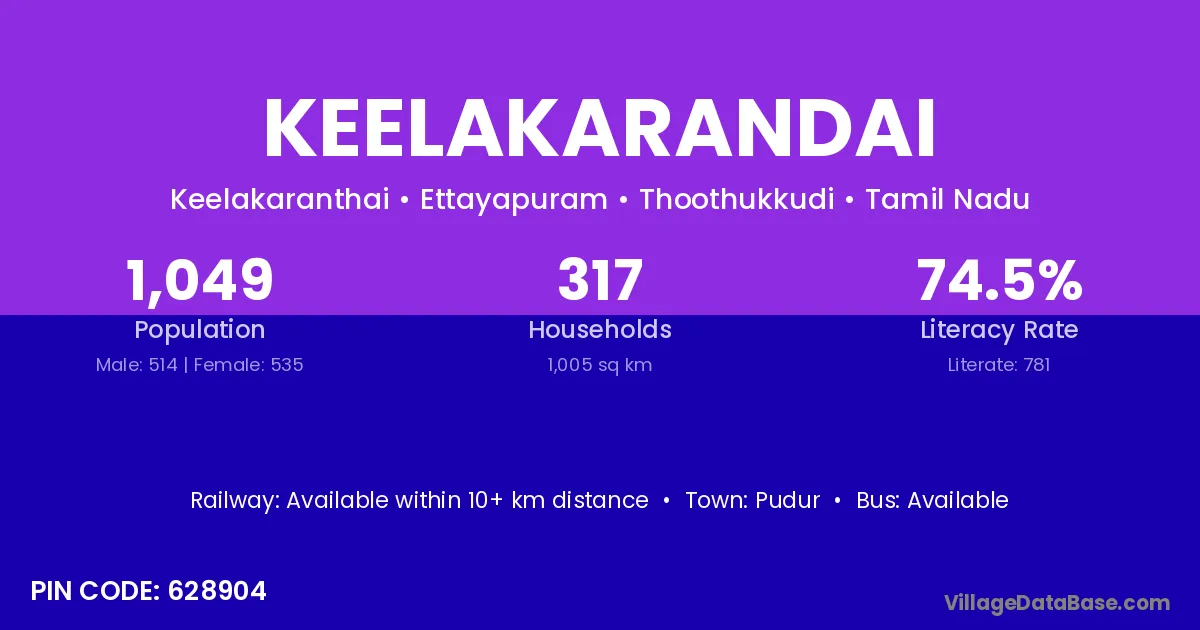 Keelakarandai village has a total population of 1,049 people, of which 514 are males and 535 are females.