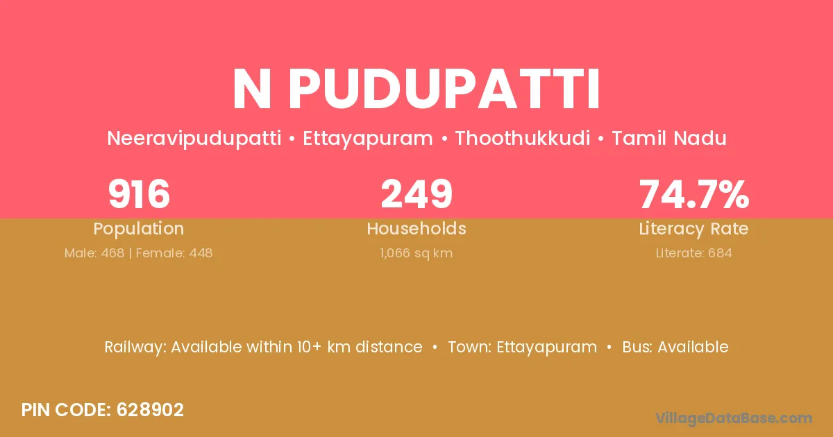 Ettayapuram is the nearest town to N Pudupatti village for major economic activities