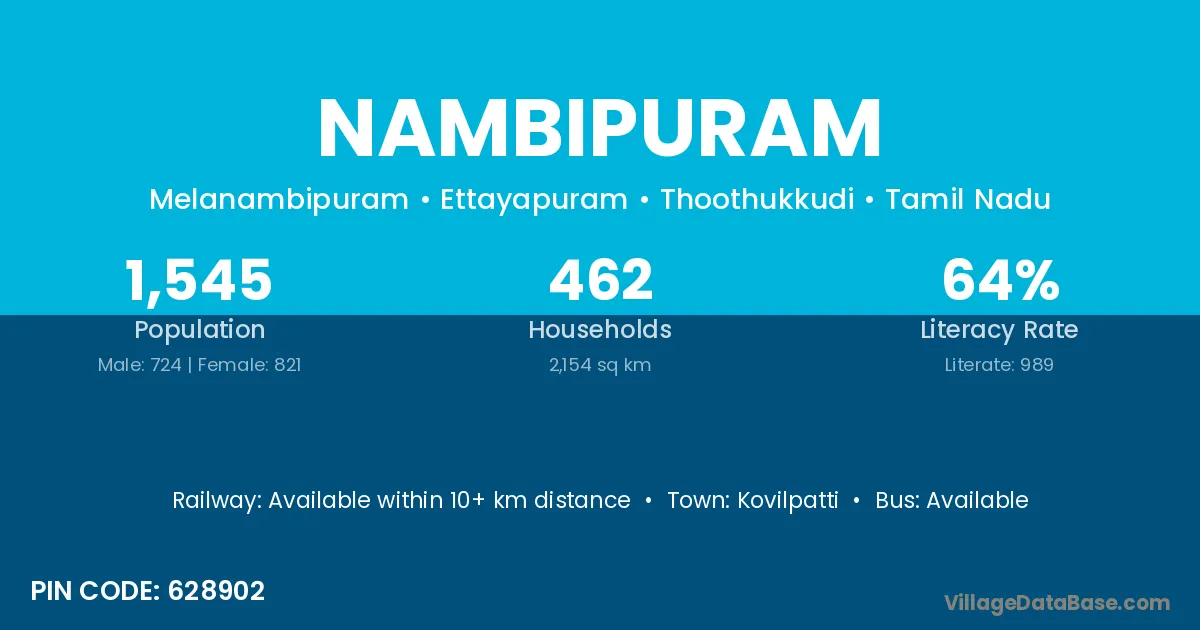 Kovilpatti is the nearest town to Nambipuram village for major economic activities